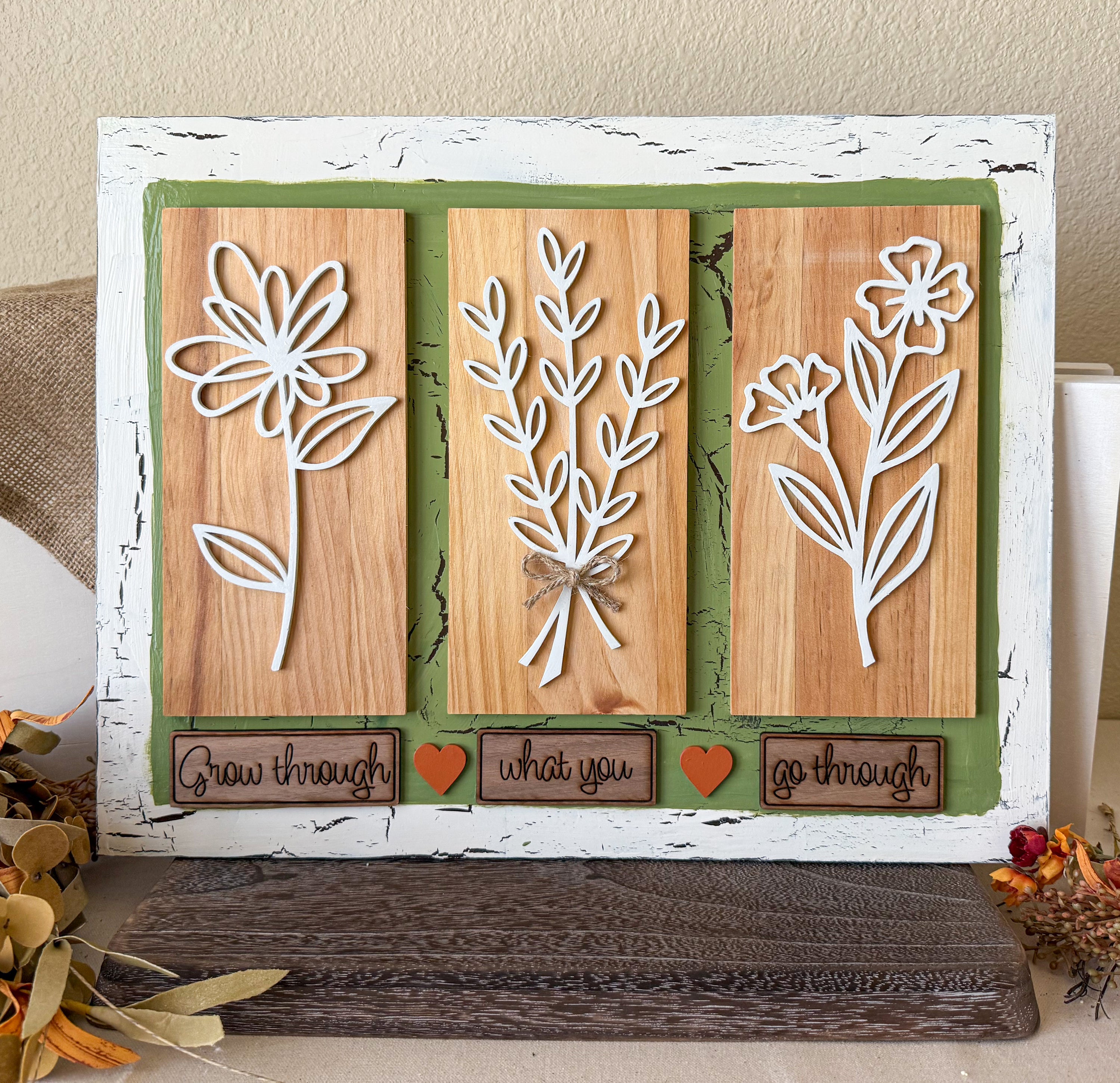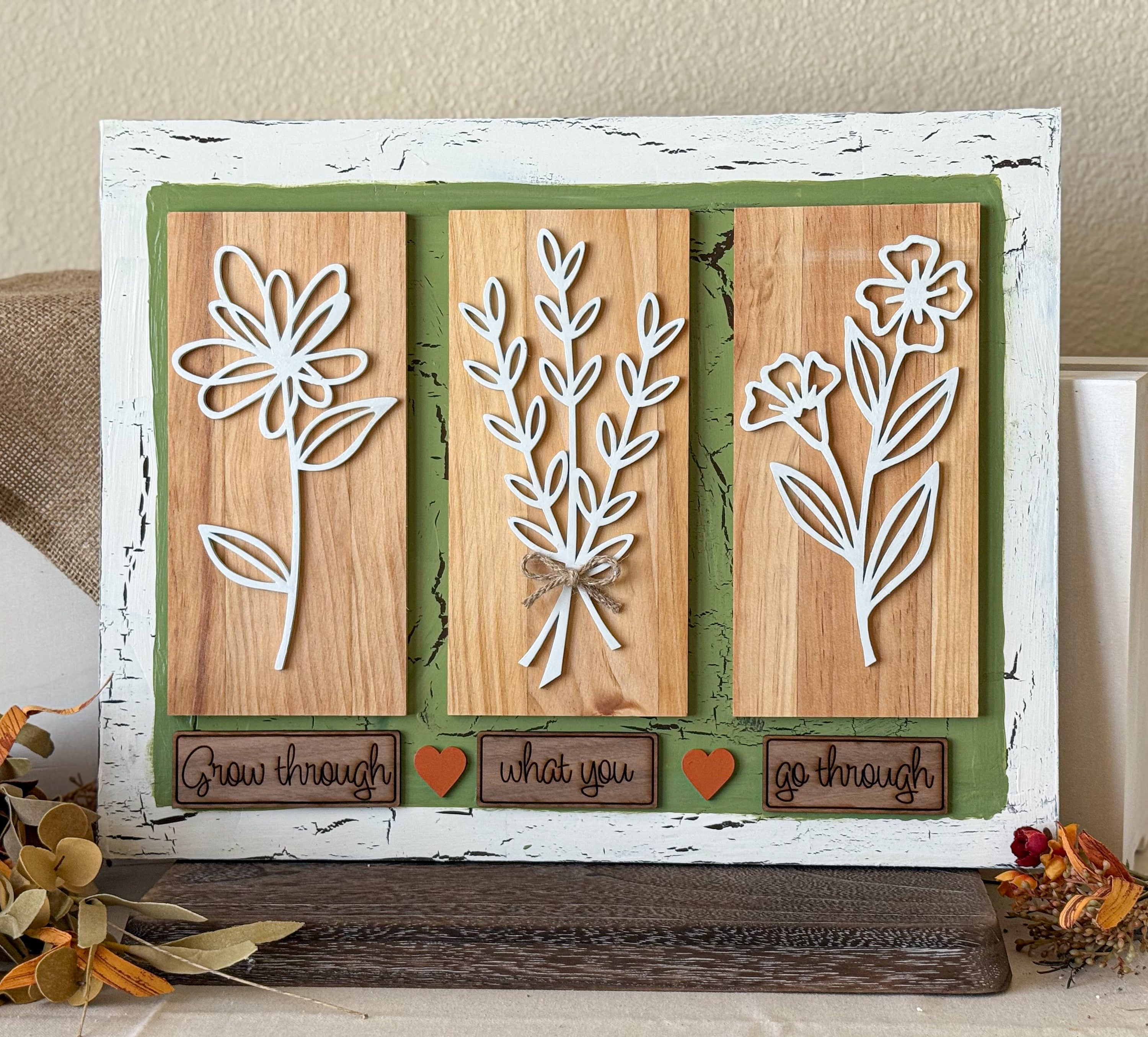Add a simple but elegant piece to your home with this floral wooden artwork, made from hand drawn flowers that are laser cut, engraved walnut pieces with "grow through what you go through" and painted wooden heart pieces. They are adhered to 18in x 14 in wooden canvas with keyhole cutout on the back. All painted areas are sealed with acrylic non yellowing gloss sealer.